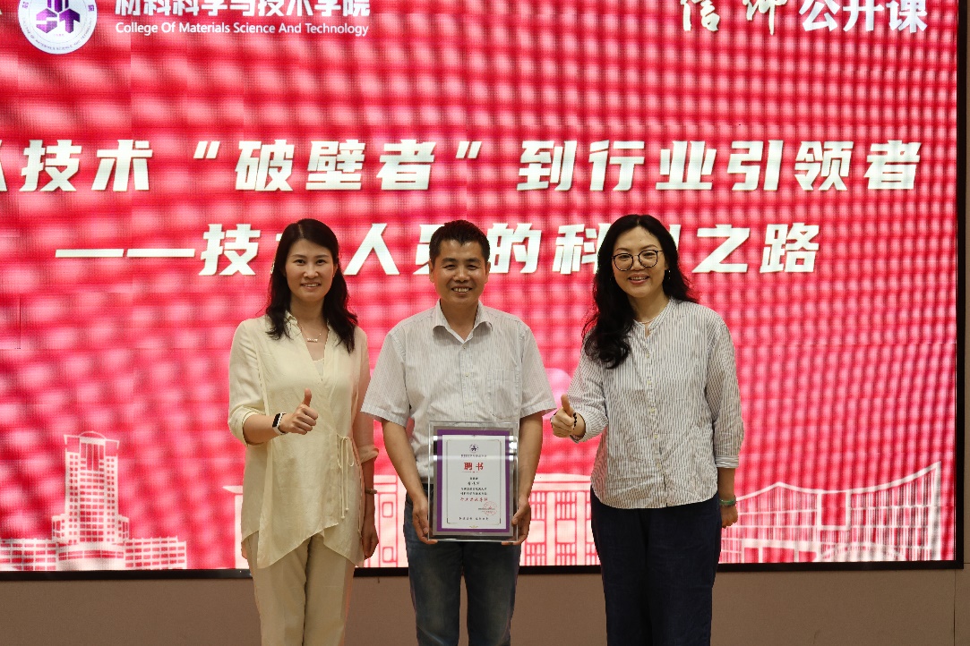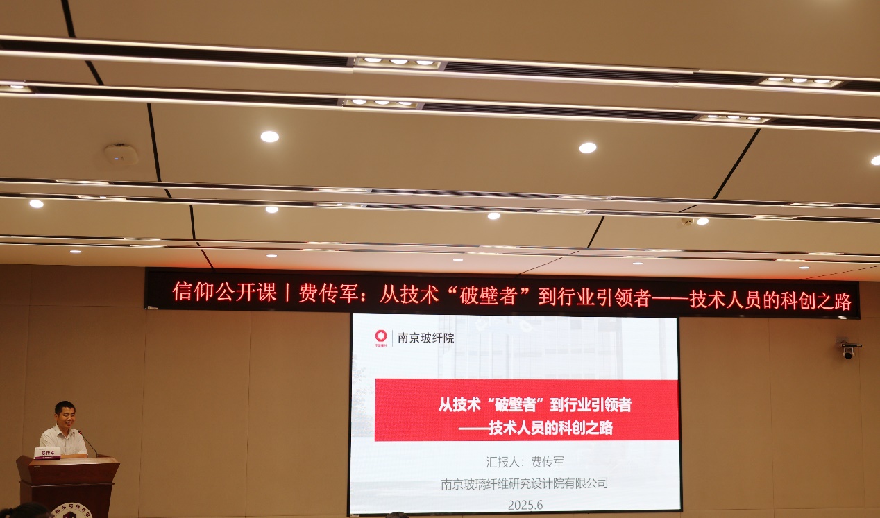 5月16日,由午夜av 团委主办、午夜av 团委承办的“从技术‘破壁者’到行业引领者”信仰公开课在将军路校区午夜av 报告厅举行。本次信仰公开课邀请国务院津贴获得者、南京玻璃纤维研究院有限公司膜材料的技术带头人费传军主讲,材料科学与技术院党委副书记庄晓舒、材料加工系党支部书记潘蕾及100余名学生现场参与。
