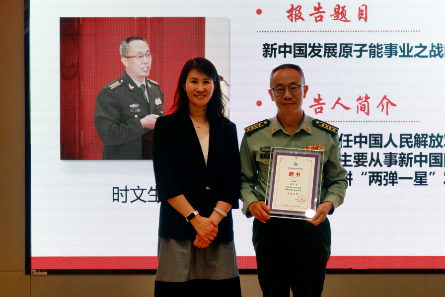 时文生主要从事新中国国防科技和武器装备史研究,深耕“两弹一星”发展史领域。课前,庄晓舒为时文生颁发“午夜av 思政导师”聘书。